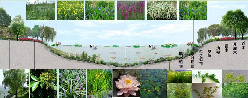 觀賞性:引入物種應(yīng)滿足景觀的要求,具有良好的景觀觀賞價(jià)值。特別在沉水植被的配置上,兼顧暖水性和冷水性物種,保證四季見綠。