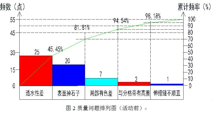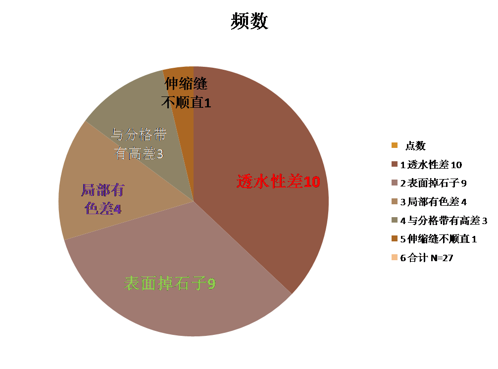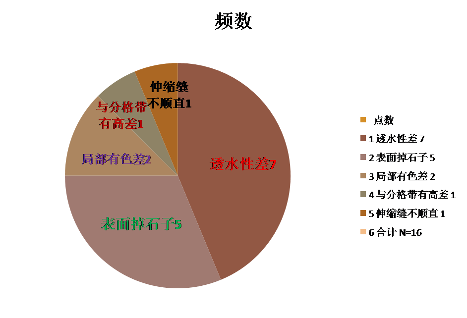 小組應(yīng)用《帕米孔藝術(shù)路面施工作業(yè)指導(dǎo)書(shū)》進(jìn)行施工,并對(duì)鞏固期內(nèi)2021年2月~3月施工的樁號(hào)為24+000~24+675透水混凝土施工的帕米孔藝術(shù)路面的質(zhì)量進(jìn)行抽檢,共采集350點(diǎn),合格點(diǎn)334點(diǎn),合格率95.4%。我們對(duì)這些不合格點(diǎn)進(jìn)行了匯總、分析,繪制了統(tǒng)計(jì)表如下: