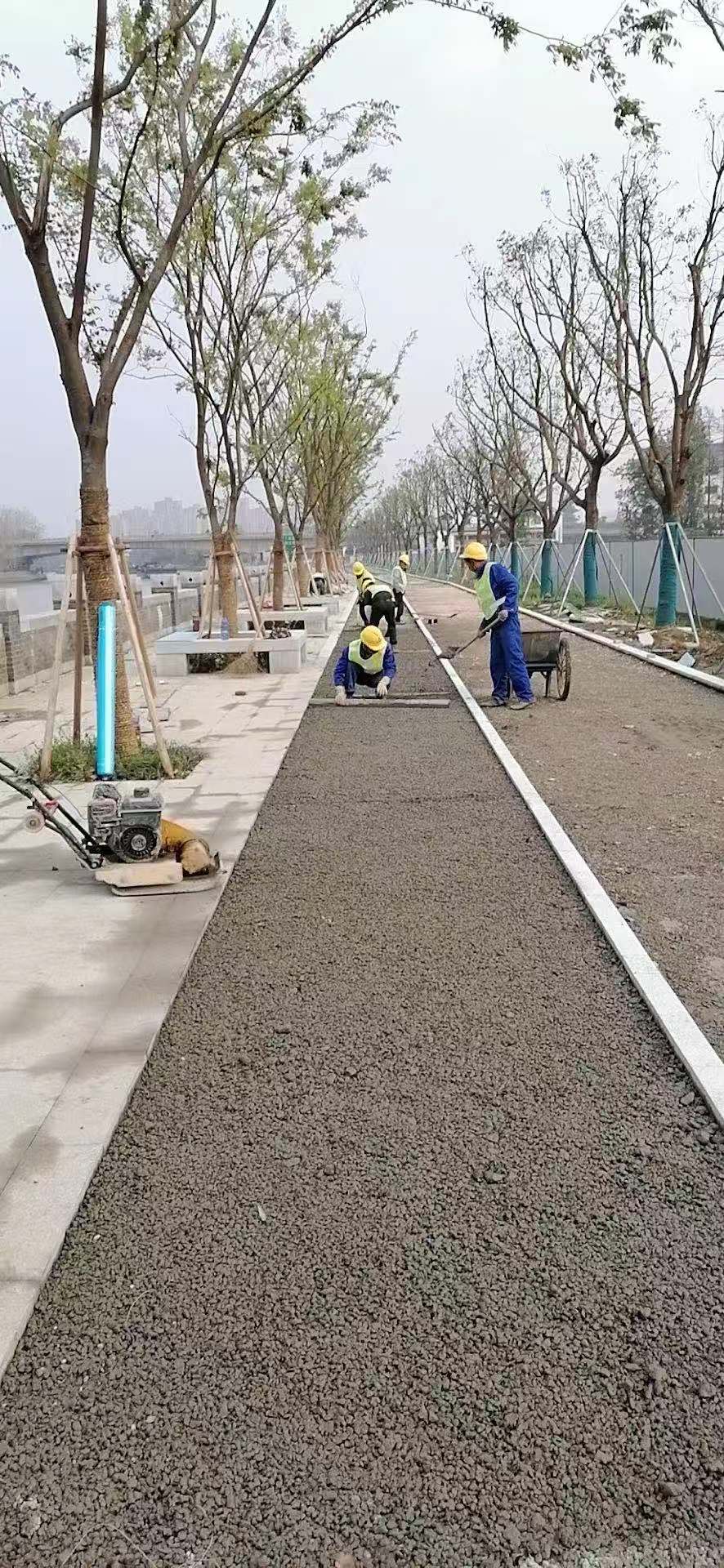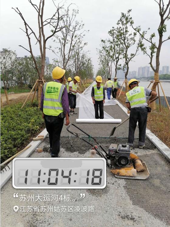 我公司中標(biāo)的京杭大運(yùn)河蘇州段[姑蘇區(qū)]堤防加固工程四標(biāo)段工程的施工內(nèi)容涉及堤防加固工程(景觀及水工)和支河橋梁工程。本標(biāo)段(何山橋~晉源橋段)結(jié)合景觀方案,全線考慮新建健康步道與騎行道貫通布置,樁號(hào)20+268~24+675,道路總長(zhǎng)度為4.407km,采用帕米孔藝術(shù)路面,路面寬5m,總面積為22035m2,堤頂?shù)缆方Y(jié)構(gòu)層從上至下依次為:100mm帕米孔天然石露骨料藝術(shù)路面面層、成品防裂鋼絲網(wǎng)片、20mm碎石緩沖層、200mmC20素混凝土層、100mm級(jí)配碎石墊層、300mm地表清雜,4%灰土回填。