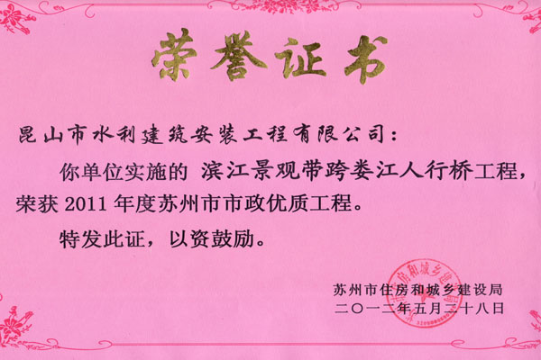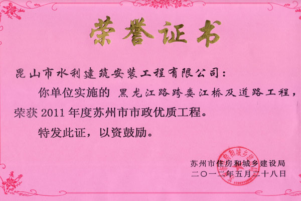 我公司承建的“昆山市西大橋工程”、“黑龍江路跨婁江橋及道路工程”和“濱江景觀帶跨婁江人行橋工程”喜獲2011年度蘇州市市政優(yōu)質(zhì)工程獎(jiǎng)。