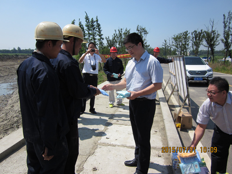 昆山市水利局局長(zhǎng)景局一行人向南部水鄉(xiāng)三期一標(biāo)現(xiàn)場(chǎng)施工人員分發(fā)防暑用品: