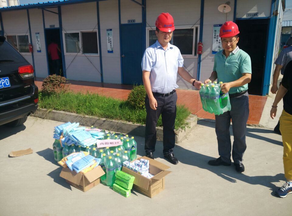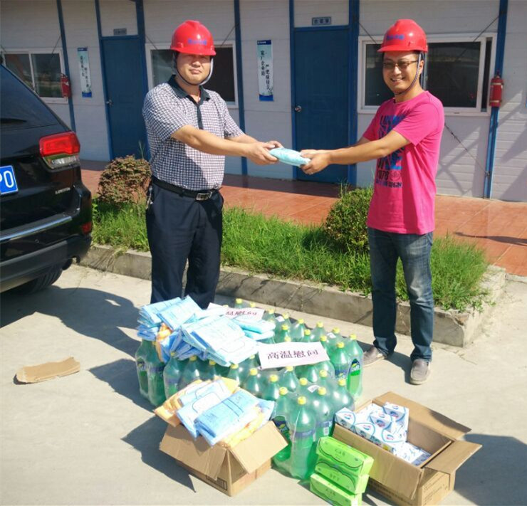 2015年7、8月高溫天連續(xù)不斷,超過(guò)十多天連續(xù)最高溫度35℃以上,水利局及水建公司一行人員向一線職工贈(zèng)送防暑降溫用品,保障高溫作業(yè)職工身體健康,督促項(xiàng)目部落實(shí)防暑降溫相關(guān)政策規(guī)定,根據(jù)夏季高溫特點(diǎn),調(diào)整高溫作業(yè)工時(shí),實(shí)施高溫錯(cuò)時(shí)作業(yè),改善高溫作業(yè)職工勞動(dòng)條件,重點(diǎn)關(guān)注現(xiàn)場(chǎng)施工人員的生產(chǎn)生活環(huán)境。
