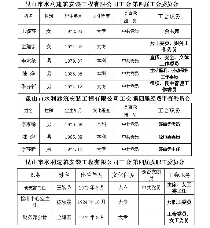 2016年9月10日,我公司第四屆工會委員會選舉大會在公司四樓會議室召開,本次代表大會有正式代表21人,實到20人,會議以無記名投票等額選舉產生昆山市水利建筑安裝工程有限公司工會第四屆委員會和經費審查委員會,以民主協(xié)商的方式產生了第四屆女工委員會,同時召開了全體委員第一次會議,產生了工會主席和經審委主任、女工委主任,選舉結果如下: