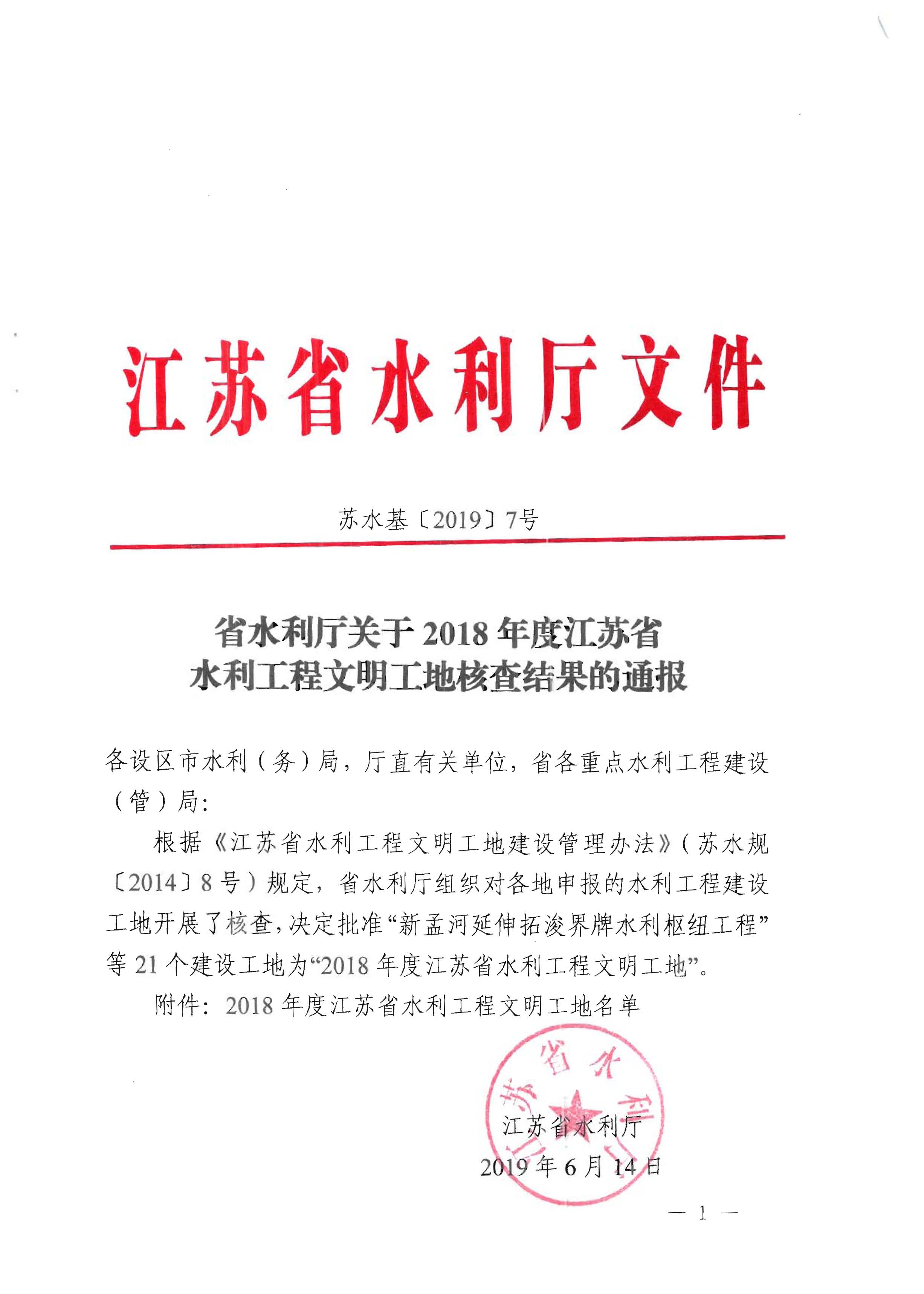 省水利廳關(guān)于2018年度江蘇省水利工程文明工地核查結(jié)果的通報(bào)